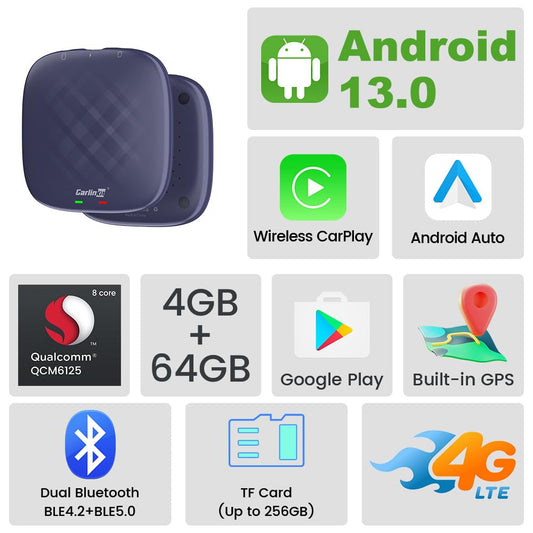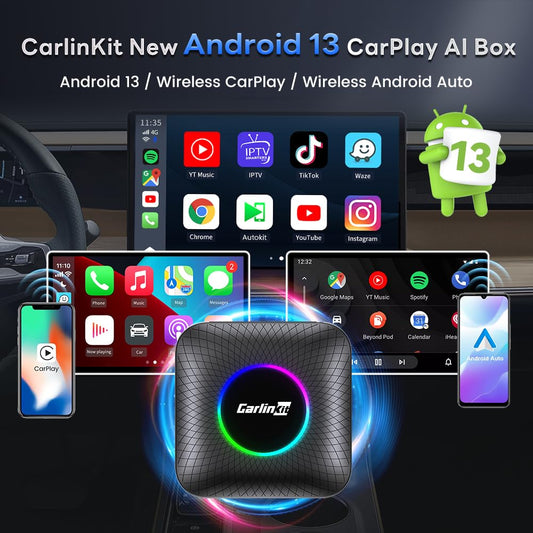 Carlinkit Android 13 Ai Box LED Version, Qualcomm 8 Cores, 8+128GB, 3-in-1 Adapter with 4G Cellular, Streaming Video, SIM/TF Card, Built-in Google Play, Only Suitable for Factory Wired CarPlay Cars